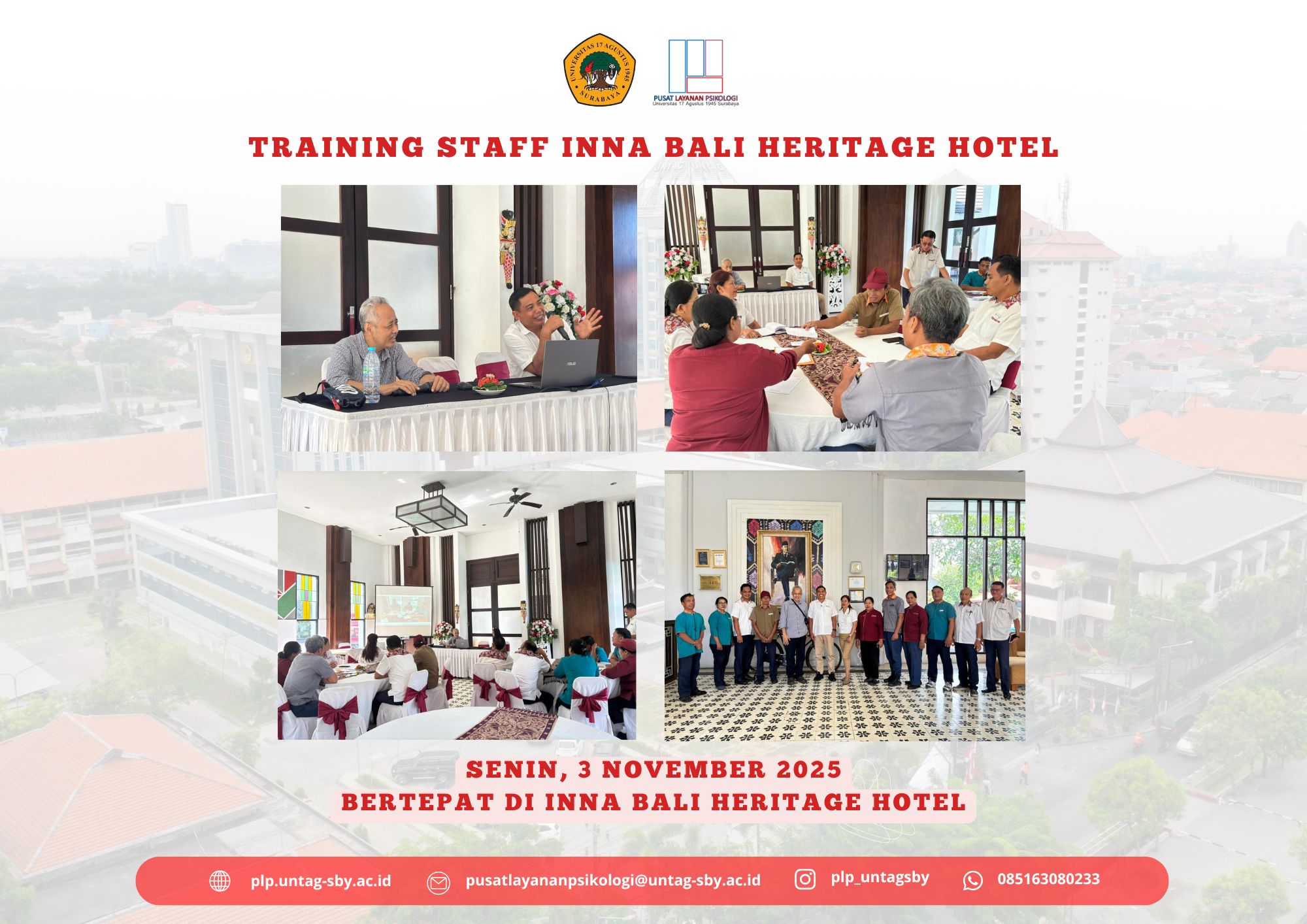 Pusat Layanan Psikologi melaksanakan kegiatan Training Pengembangan Staf Inna Bali Heritage Hotel pada Senin, 3 November 2025, bertempat di Inna Bali Heritage Hotel, Denpasar.
